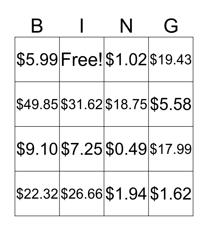 This bingo card has 19 words: $0.49, $0.84, $1.02, $1.62, $17.99, $49.85, $1.94, $5.99, Free!, $9.10, $7.25, $31.62, $18.75, $26.66, $22.32, $5.37, $19.43, $5.58 and $6.61.