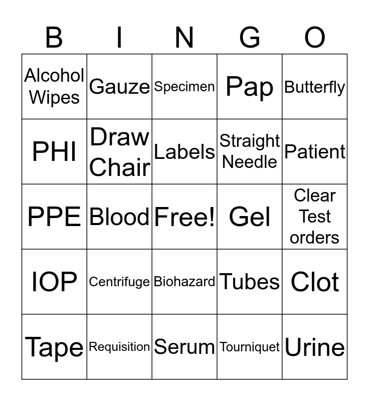 This bingo card has a free space and 24 words: Centrifuge, Requisition, Labels, Tape, Butterfly, Alcohol Wipes, PHI, Gauze, Gel, Biohazard, Straight Needle, PPE, Tubes, Clot, Draw Chair, Tourniquet, Clear Test orders, Specimen, Patient, Blood, Urine, IOP, Pap and Serum.
