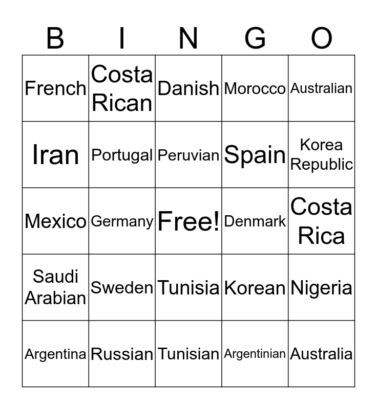 This bingo card has a free space and 62 words: Russia, Russian, Saudi Arabia, Saudi Arabian, Uruguay, Uruguayan, Portugal, Portuguese, Spain, Spanish, Morocco, Moroccan, Iran, Iranian, France, French, Australia, Australian, Peru, Peruvian, Denmark, Danish, Argentina, Argentinian, Iceland, Icelander, Croatia, Croatian, Nigeria, Nigerian, Brazil, Brazilian, Switzerland, Swiss, Costa Rica, Costa Rican, Serbia, Serbian, Germany, German, Mexico, Mexican, Sweden, Swedish, Korea Republic, Korean, Belgium, Belgian, Panama, Panamanian, Tunisia, Tunisian, England, English, Poland, Polish, Senegal, Senegalese, Colombia, Colombian, Japan and Japanese.