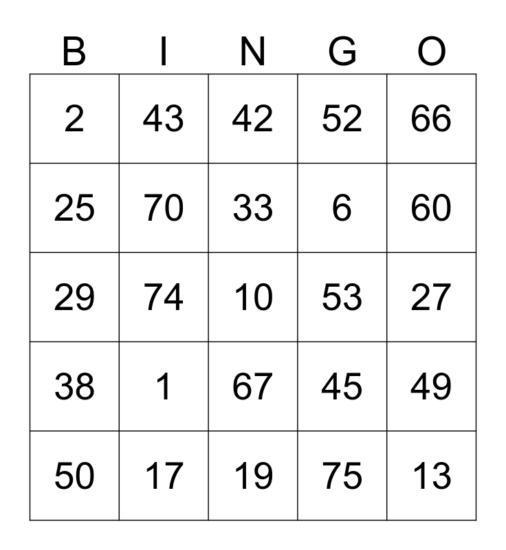 This bingo card has 25 words: 1, 19, 33, 50, 66, 2, 25, 43, 53, 67, 6, 29, 45, 49, 70, 13, 27, 42, 60, 74, 10, 17, 38, 52 and 75.