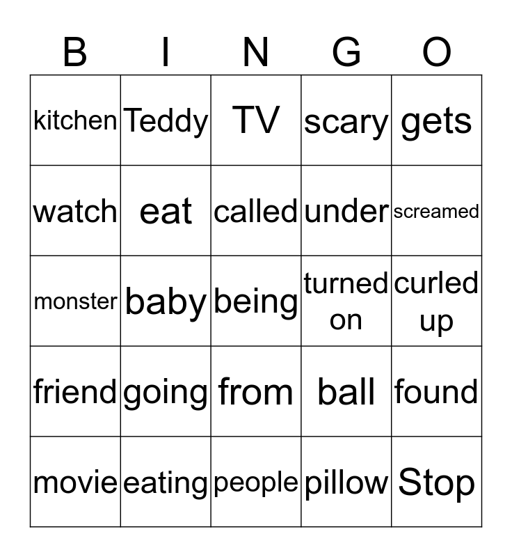 This bingo card has 28 words: found, remote, under, pillow, watch, TV, Teddy, friend, turned on, movie, monster, scary, eating, people, screamed, Help, going, eat, called, from, kitchen, Stop, being, baby, curled up, ball, gets and sad.