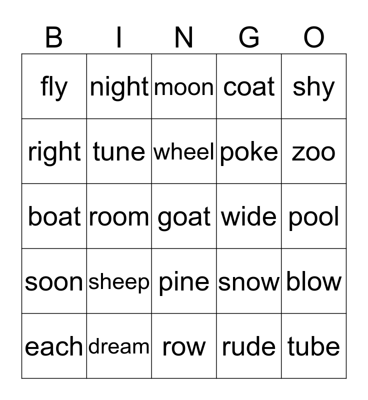 This bingo card has a free space and 24 words: sheep, dream, wheel, each, shy, fly, right, night, wide, pine, poke, boat, snow, blow, tune, rude, pool, moon, zoo, room, tube, soon, coat and row.