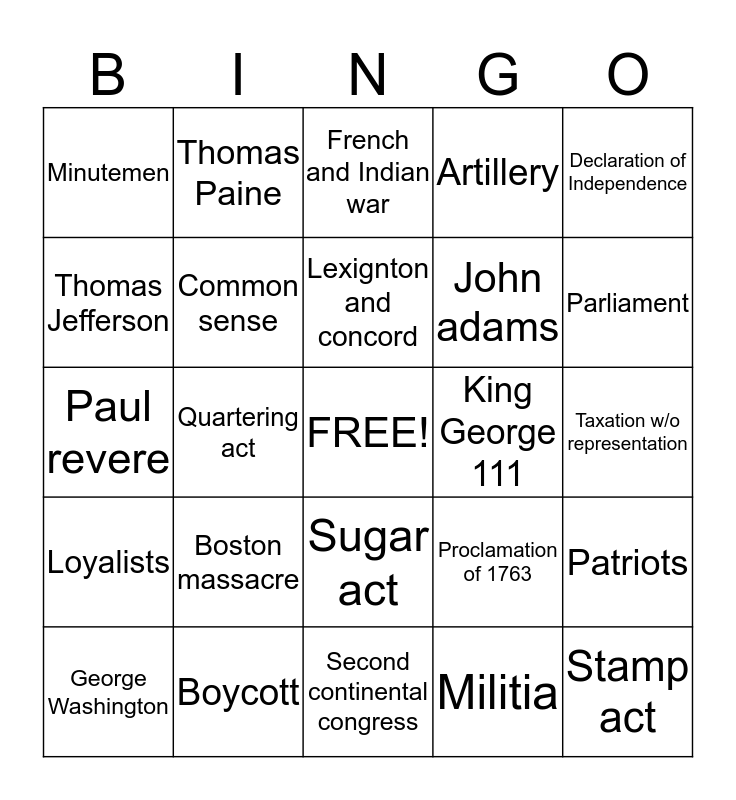 This bingo card has a free space and 24 words: Boston massacre, Boycott, Lexignton and concord, George Washington, Declaration of Independence, Minutemen, Thomas Jefferson, Thomas Paine, King George 111, Sugar act, John adams, Paul revere, Proclamation of 1763, Patriots, Common sense, Militia, Taxation w/o representation, French and Indian war, Parliament, Quartering act, Stamp act, Loyalists, Artillery and Second continental congress.
