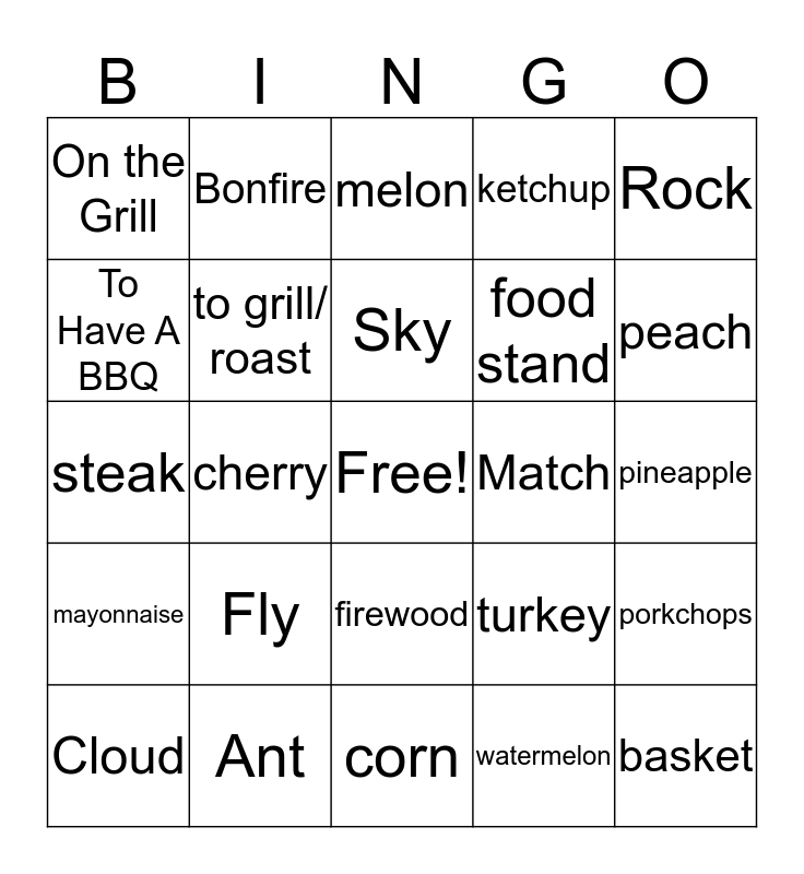 This bingo card has a free space and 24 words: Fly, Ant, Sky, Cloud, Rock, On the Grill, To Have A BBQ, Bonfire, Match, firewood, food stand, steak, turkey, porkchops, to grill/ roast, watermelon, pineapple, melon, peach, cherry, basket, mayonnaise, ketchup and corn.