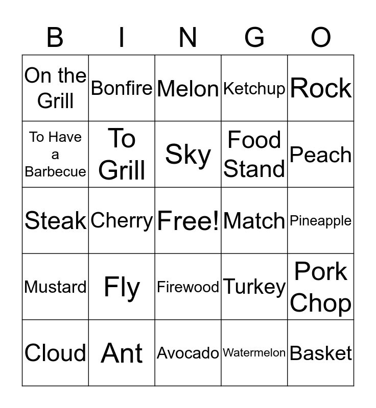 This bingo card has a free space and 24 words: Fly, Ant, Sky, Cloud, Rock, On the Grill, To Have a Barbecue, Bonfire, Match, Firewood, Food Stand, Steak, Turkey, Pork Chop, To Grill, Watermelon, Pineapple, Melon, Peach, Cherry, Basket, Mustard, Ketchup and Avocado.