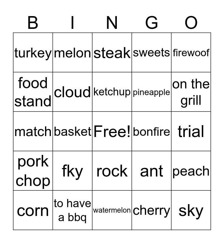This bingo card has a free space and 24 words: fky, to have a bbq, ketchup, corn, firewoof, turkey, food stand, melon, bonfire, rock, pineapple, match, ant, peach, cloud, cherry, trial, steak, on the grill, basket, sky, pork chop, sweets and watermelon.