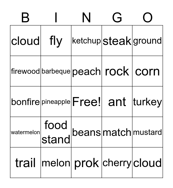 This bingo card has a free space and 24 words: food stand, melon, peach, trail, ground, cloud, firewood, fly, ant, beans, rock, bonfire, match, mustard, barbeque, cherry, turkey, ketchup, corn, pineapple, cloud, watermelon, steak and prok.