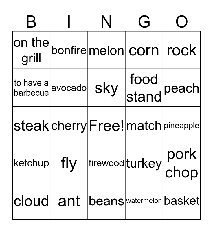 This bingo card has a free space and 24 words: fly, ant, sky, cloud, rock, on the grill, to have a barbecue, bonfire, match, firewood, food stand, steak, turkey, pork chop, avocado, watermelon, pineapple, melon, peach, cherry, basket, ketchup, corn and beans.