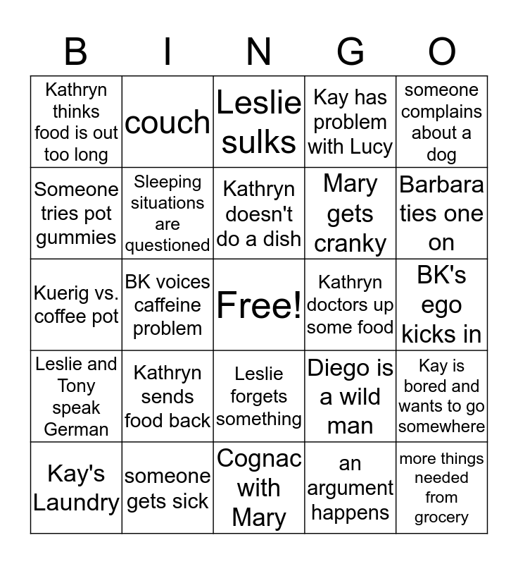 This bingo card has a free space and 24 words: Kay's Laundry, Kathryn sends food back, Kathryn doesn't do a dish, an argument happens, someone complains about a dog, Kathryn thinks food is out too long, couch, Leslie sulks, Kathryn doctors up some food, BK's ego kicks in, Kuerig vs. coffee pot, Sleeping situations are questioned, Diego is a wild man, Kay is bored and wants to go somewhere, Someone tries pot gummies, someone gets sick, Cognac with Mary, Kay has problem with Lucy, Barbara ties one on, Leslie and Tony speak German, BK voices caffeine problem, Leslie forgets something, Mary gets cranky and more things needed from grocery.