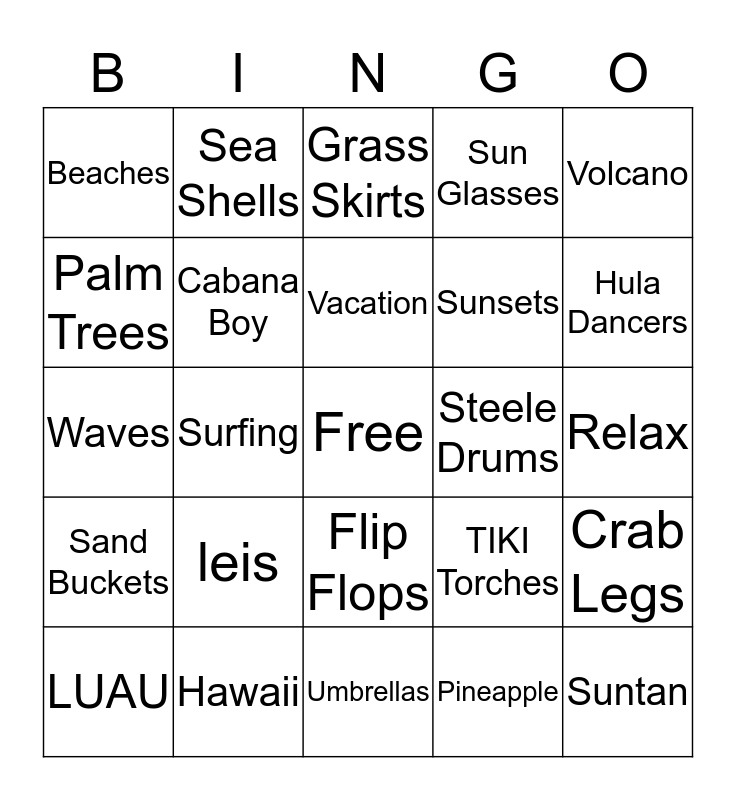 This bingo card has a free space and 24 words: leis, Hawaii, Vacation, LUAU, Volcano, Beaches, Palm Trees, Sea Shells, Steele Drums, Flip Flops, Sunsets, Waves, TIKI Torches, Crab Legs, Cabana Boy, Pineapple, Relax, Grass Skirts, Hula Dancers, Surfing, Suntan, Sand Buckets, Sun Glasses and Umbrellas.
