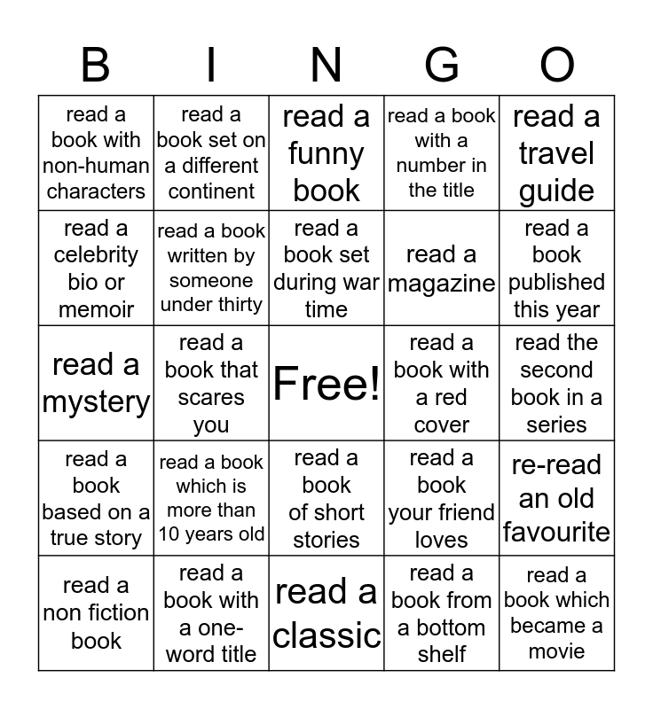 This bingo card has a free space and 24 words: read a book which is more than 10 years old, read a book with a one-word title, read a book set during war time, read a non fiction book, read a travel guide, read a book with non-human characters, read a celebrity bio or memoir, read a book set on a different continent, read a book with a red cover, read a book of short stories, read a magazine, read a mystery, read a book your friend loves, re-read an old favourite, read a book written by someone under thirty, read a book from a bottom shelf, read the second book in a series, read a funny book, read a book published this year, read a book that scares you, read a book which became a movie, read a book based on a true story, read a book with a number in the title and read a classic.