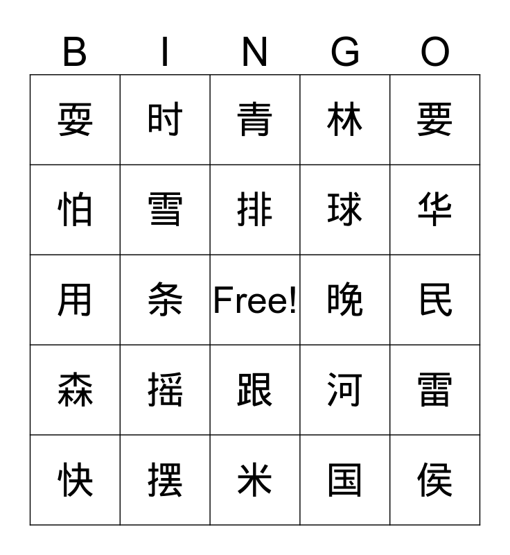 This bingo card has a free space and 24 words: 摇, 摆, 排, 快, 要, 耍, 怕, 时, 晚, 跟, 球, 用, 河, 雷, 雪, 国, 民, 青, 华, 条, 侯, 森, 林 and 米.