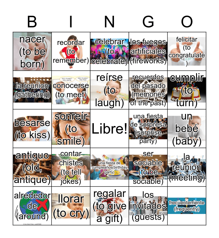 This bingo card has 24 images, a free space and 24 words: contar chistes (to tell jokes), llorar (to cry), reírse (to laugh), alrededor de (around), felicitar (to congratulate ), nacer (to be born), la reunion (gathering), recordar (to remember), una fiesta de sorpresa (surprise party), una fiesta de cumpleaños(birthday party), recuerdos del pasado (memories of the past), besarse (to kiss), ser sociable (to be sociable), la reunión (meeting), conocerse (to meet), los invitados (guests), un bebé (baby), celebrar (to celebrate), cumplir (to turn), sonreír (to smile), frecuentemente (frequently), antiguo (old, antique), los fuegos artificiales (fireworks) and regalar (to give a gift).