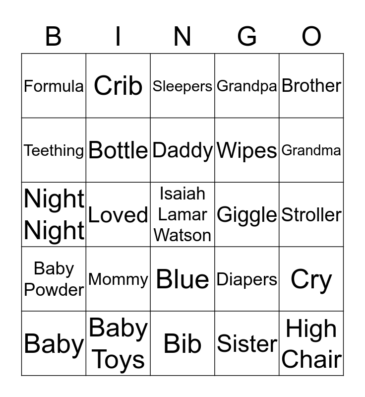 This bingo card has a free space and 24 words: Baby, Mommy, Daddy, Sister, Brother, Formula, Crib, Sleepers, Giggle, Stroller, Night Night, Bottle, Diapers, Cry, Teething, Baby Toys, Bib, Grandpa, Grandma, Baby Powder, Loved, Blue, Wipes and High Chair.