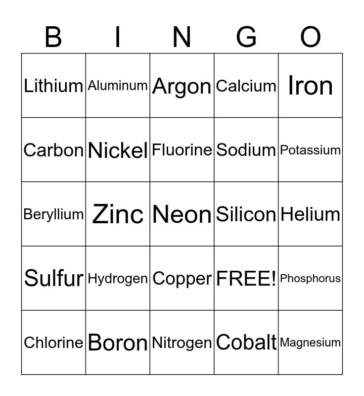 This bingo card has 25 words: Hydrogen, Nitrogen, Fluorine, Chlorine, Iron, Lithium, Carbon, Aluminum, Silicon, Copper, Sodium, Beryllium, FREE!, Phosphorus, Nickel, Magnesium, Helium, Argon, Potassium, Zinc, Neon, Boron, Sulfur, Calcium and Cobalt.