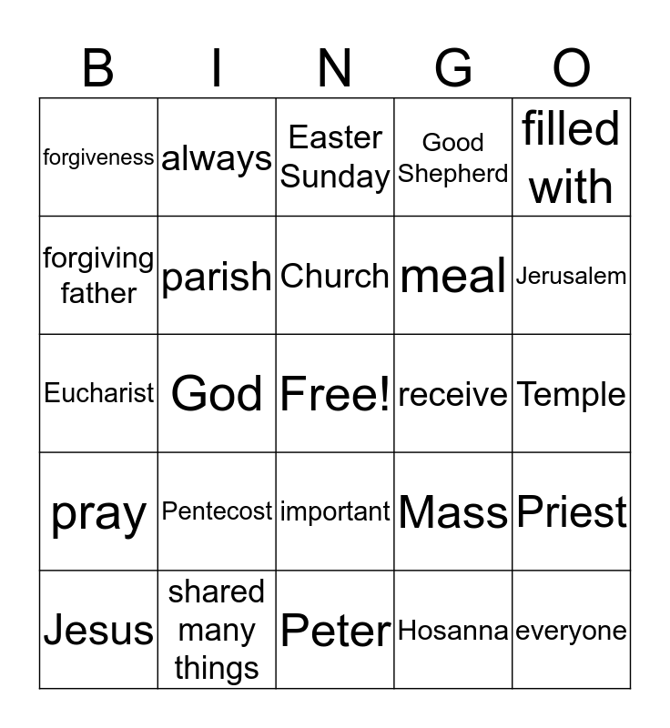 This bingo card has a free space and 24 words: Pentecost, shared many things, Church, Jesus, filled with, forgiveness, forgiving father, always, receive, important, meal, Eucharist, Mass, Priest, parish, Hosanna, Temple, Easter Sunday, Jerusalem, God, everyone, pray, Good Shepherd and Peter.