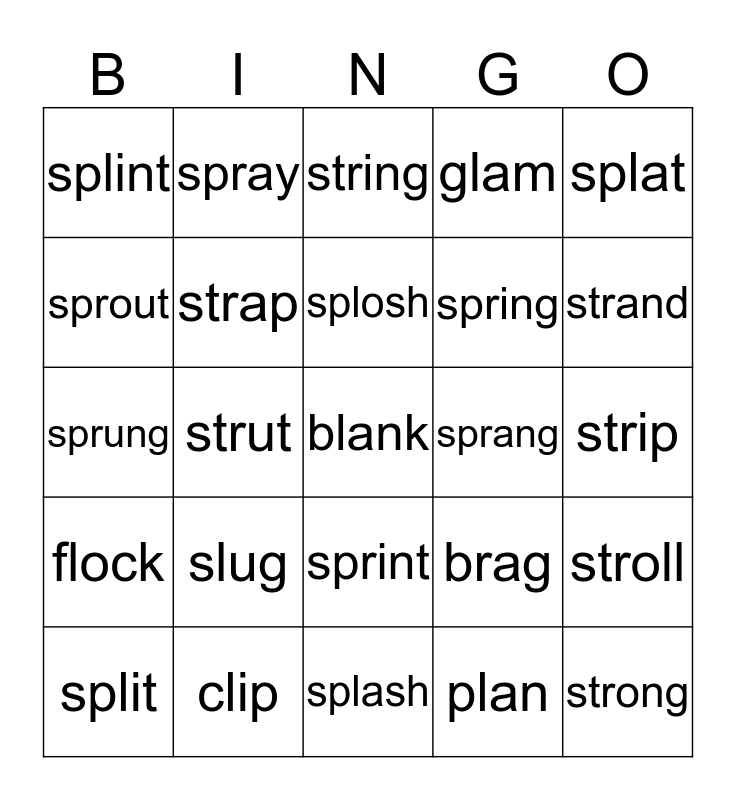 This bingo card has 25 words: slug, splash, splosh, split, splat, splint, sprout, spray, sprang, sprint, spring, sprung, brag, stroll, strap, strong, strip, string, strand, strut, blank, clip, flock, glam and plan.