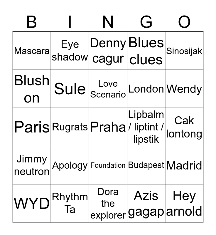 This bingo card has a free space and 24 words: Apology, Rhythm Ta, Love Scenario, WYD, Sinosijak, Mascara, Blush on, Eye shadow, Lipbalm / liptint / lipstik, Foundation, London, Paris, Budapest, Madrid, Sule, Azis gagap, Cak lontong, Denny cagur, Wendy, Rugrats, Hey arnold, Jimmy neutron, Blues clues and Dora the explorer.