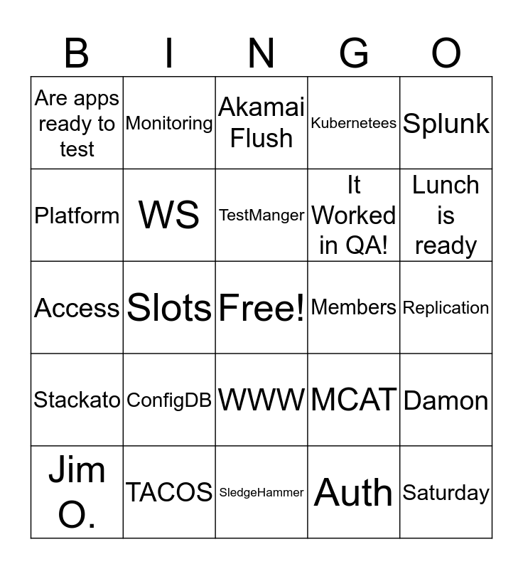 This bingo card has a free space and 24 words: ConfigDB, TACOS, TestManger, Jim O., Splunk, Are apps ready to test, Platform, Monitoring, Members, WWW, It Worked in QA!, Access, MCAT, Damon, WS, Auth, Replication, Akamai Flush, Lunch is ready, Slots, Saturday, Stackato, Kubernetees and SledgeHammer.