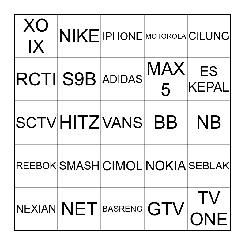 This bingo card has a free space and 24 words: SMASH, NET, ADIDAS, NEXIAN, CILUNG, XO IX, RCTI, NIKE, BB, CIMOL, MAX 5, SCTV, NOKIA, SEBLAK, S9B, GTV, NB, IPHONE, ES KEPAL, HITZ, TV ONE, REEBOK, MOTOROLA and BASRENG.