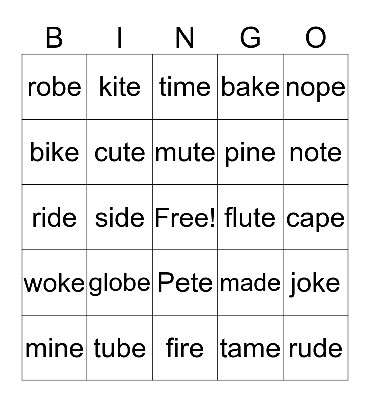 This bingo card has a free space and 35 words: cake, like, rode, cute, Pete, bake, bike, hope, mute, take, ride, nope, same, hide, robe, flute, tame, side, woke, rude, made, mine, joke, tube, time, note, cube, huge, pine, cape, stage, fire, globe, kite and ripe.