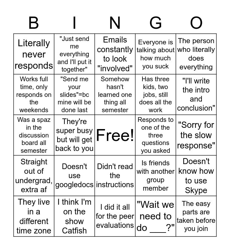 This bingo card has a free space and 24 words: They live in a different time zone, Doesn't use googledocs, Somehow hasn't learned one thing all semester, "Wait we need to do ___?", The person who literally does everything, Literally never responds, "Just send me everything and I'll put it together", Emails constantly to look "involved", Responds to one of the three questions you asked, "Sorry for the slow response", Was a spaz in the discussion board all semester, "Send me your slides"=bc mine will be done last, Is friends with another group member, Doesn't know how to use Skype, Works full time, only responds on the weekends, I think I'm on the show Catfish, I did it all for the peer evaluations, Everyone is talking about how much you suck, "I'll write the intro and conclusion", Straight out of undergrad, extra af, They're super busy but will get back to you, Didn't read the instructions, Has three kids, two jobs, still does all the work and The easy parts are taken before you join.