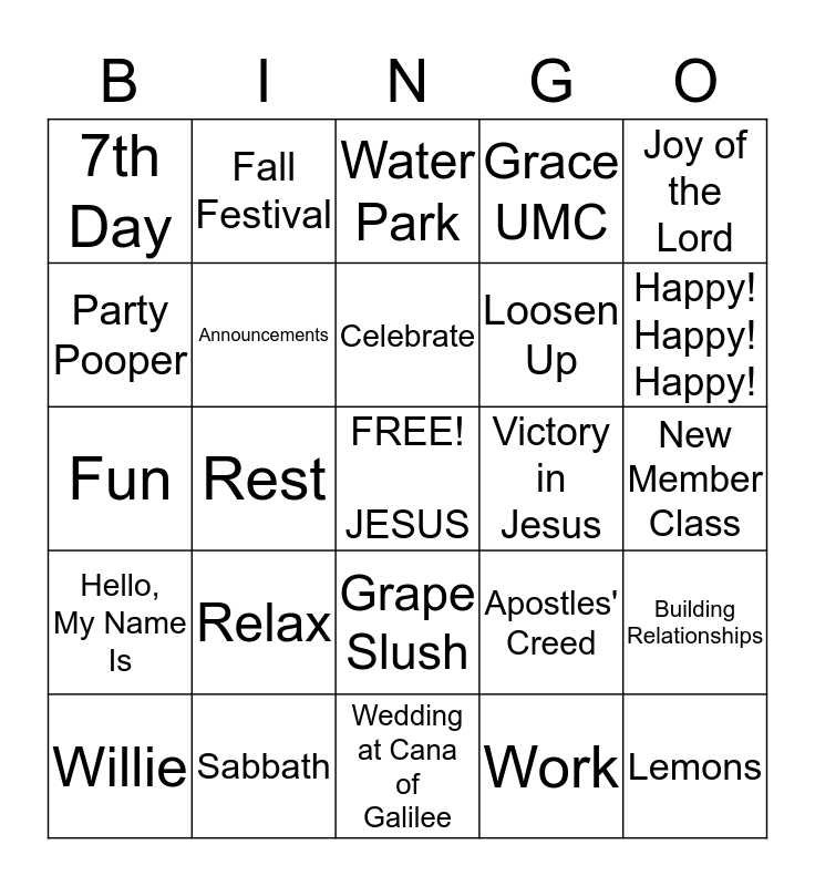 This bingo card has a free space and 24 words: Relax, Sabbath, Celebrate, Willie, Joy of the Lord, 7th Day, Party Pooper, Fall Festival, Victory in Jesus, Grape Slush, Loosen Up, Fun, Apostles' Creed, Building Relationships, Announcements, Work, New Member Class, Water Park, Happy! Happy! Happy!, Rest, Lemons, Hello, My Name Is, Grace UMC and Wedding at Cana of Galilee.