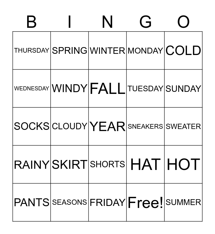 This bingo card has 32 words: Free!, WEATHER, CLOUDY, SUNNY, RAINY, WINDY, COLD, HOT, SPRING, SUMMER, FALL, WINTER, COAT, SCARF, SNEAKERS, T-SHIRT, PANTS, SOCKS, SHORTS, SKIRT, HAT, DRESS, SWEATER, SEASONS, YEAR, MONDAY, TUESDAY, WEDNESDAY, THURSDAY, FRIDAY, SATURDAY and SUNDAY.