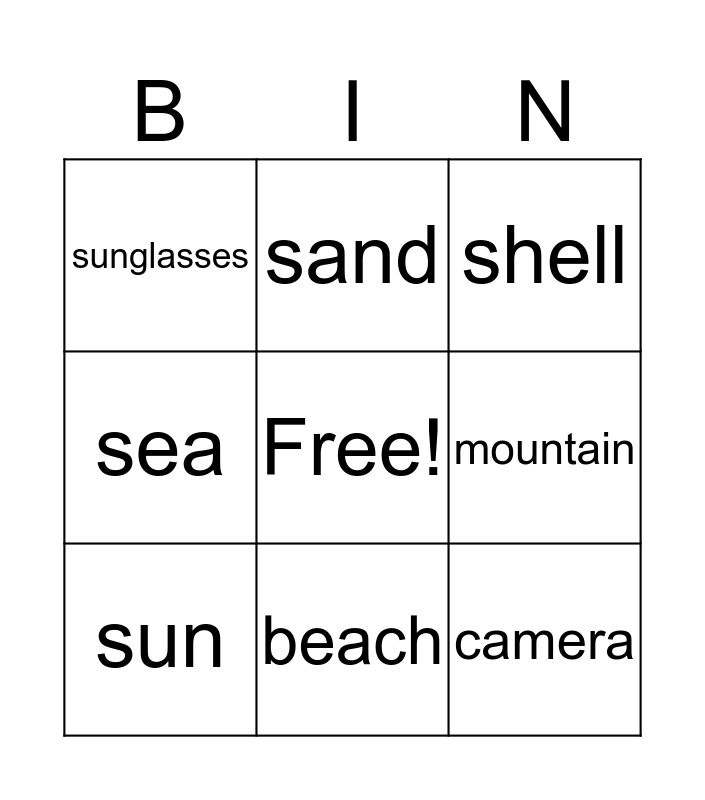This bingo card has a free space and 8 words: mountain, shell, sand, sun, sunglasses, camera, sea and beach.