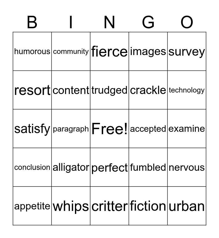 This bingo card has a free space and 52 words: downstairs, urban, building, critter, alligator, threatened, community, habitat, resort, addressing, content, neighborhood, nervous, fumbled, chuckled, nonsense, trudged, accepted, attracts, survey, paragraph, fiction, humorous, crackle, soared, starry, envelope, photograph, technology, communicate, improved, images, down, junior, huddle, fierce, whips, shuffles, echo, poetry, manage, examine, conclusion, oxygen, perfect, challenge, healthy, satisfy, manage, scratch, appetite and nocturnal.
