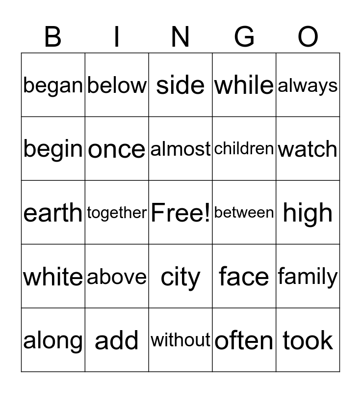This bingo card has a free space and 24 words: above, add, almost, along, always, began, begin, below, between, city, children, earth, face, family, once, often, high, side, watch, together, took, white, while and without.