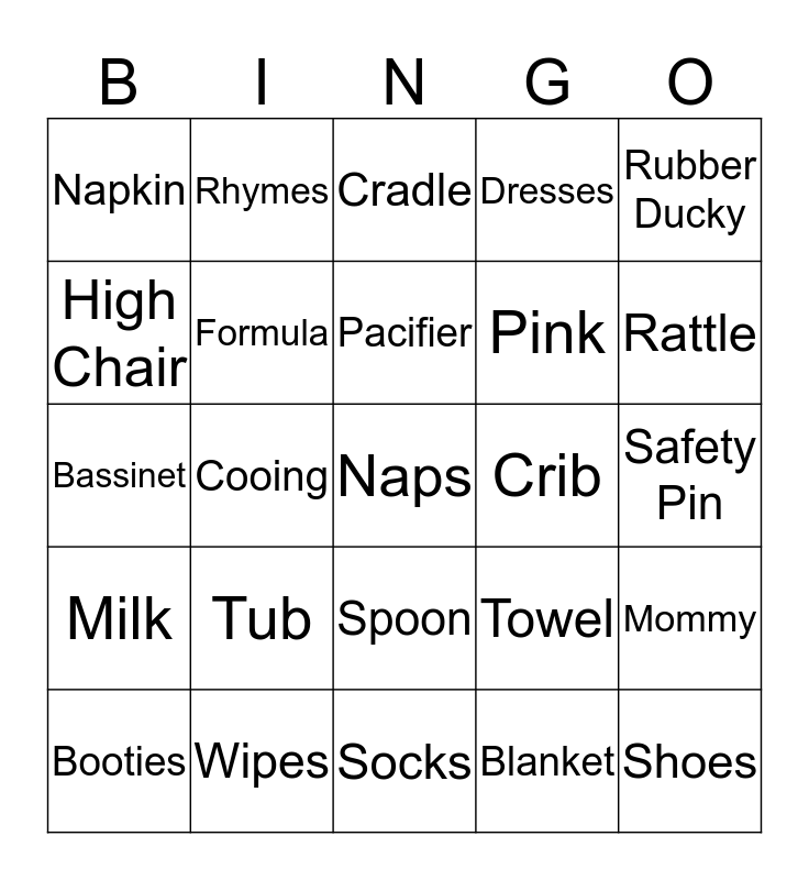 This bingo card has a free space and 34 words: Bib, Blanket, Bottle, Diaper, Milk, Formula, Rubber Ducky, Booties, Rhymes, Lullaby, Pacifier, Cradle, Bouncer, Swing, Crib, Rattle, Wipes, Bassinet, Tub, Towel, Spoon, Crayon, Napkin, Safety Pin, Socks, Shoes, Dresses, Ribbons, Pink, High Chair, Car Seat, Cooing, Mommy and Daddy.