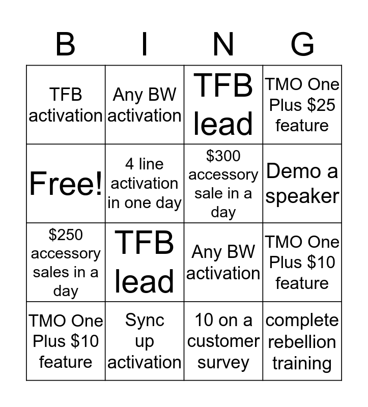 This bingo card has 16 words: Sync up activation, TMO One Plus $10 feature, TFB lead, TFB activation, $250 accessory sales in a day, Any BW activation, Any BW activation, 10 on a customer survey, Free!, 4 line activation in one day, TMO One Plus $10 feature, TMO One Plus $25 feature, TFB lead, Demo a speaker, $300 accessory sale in a day and complete rebellion training.