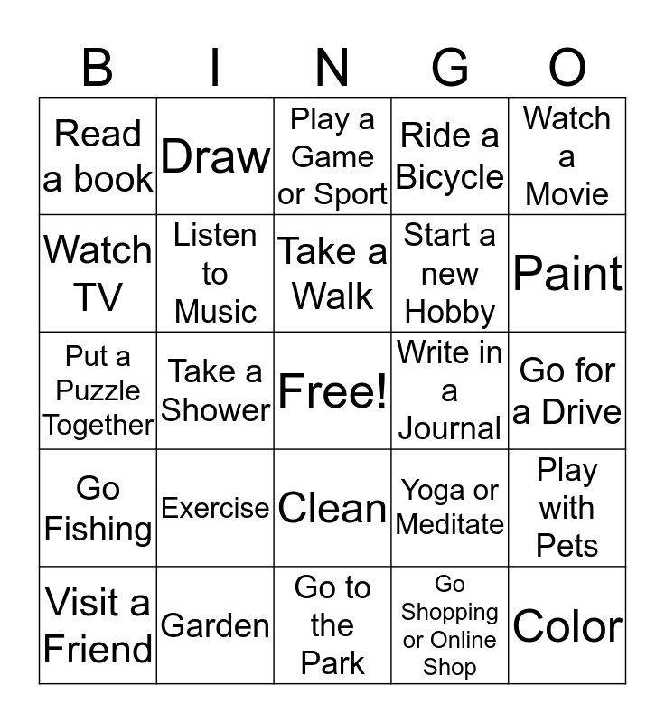 This bingo card has a free space and 24 words: Exercise, Garden, Take a Walk, Visit a Friend, Watch a Movie, Read a book, Watch TV, Draw, Write in a Journal, Clean, Start a new Hobby, Put a Puzzle Together, Yoga or Meditate, Play with Pets, Listen to Music, Go Shopping or Online Shop, Go for a Drive, Play a Game or Sport, Paint, Take a Shower, Color, Go Fishing, Ride a Bicycle and Go to the Park.