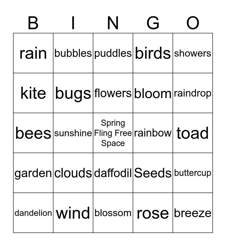 This bingo card has a free space and 24 words: clouds, wind, flowers, dandelion, showers, rain, kite, bubbles, rainbow, daffodil, bloom, bees, Seeds, buttercup, bugs, rose, toad, puddles, raindrop, sunshine, breeze, garden, birds and blossom.