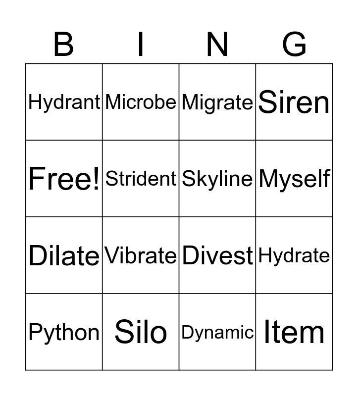 This bingo card has 16 words: Silo, Hydrate, Migrate, Hydrant, Dilate, Microbe, Divest, Dynamic, Free!, Strident, Python, Siren, Vibrate, Myself, Skyline and Item.