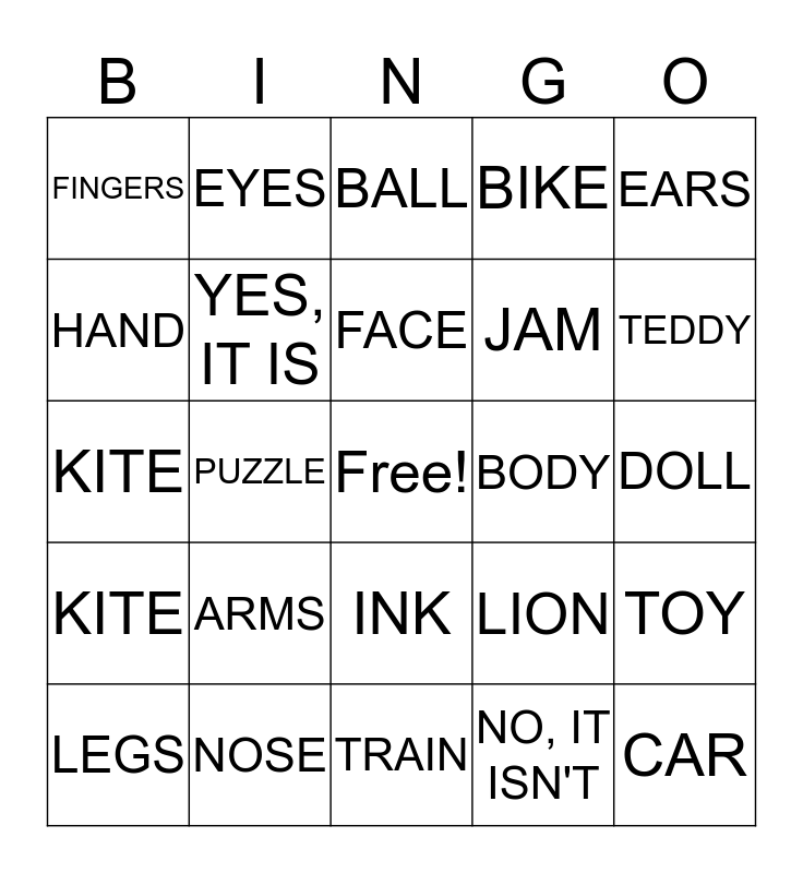 This bingo card has a free space and 24 words: ARMS, NOSE, FACE, LEGS, EARS, FINGERS, HAND, EYES, BODY, INK, JAM, KITE, LION, TOY, YES, IT IS, NO, IT ISN'T, DOLL, BALL, TEDDY, PUZZLE, CAR, KITE, BIKE and TRAIN.