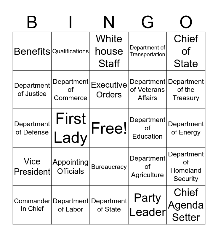 This bingo card has a free space and 24 words: Commander In Chief, Appointing Officials, Executive Orders, Party Leader, Chief of State, Benefits, Qualifications, White house Staff, Department of Education, Department of Energy, Department of Defense, Department of Commerce, Department of Agriculture, Department of Homeland Security, Department of Justice, Department of Labor, Department of State, Department of Transportation, Department of the Treasury, Vice President, First Lady, Bureaucracy, Department of Veterans Affairs and Chief Agenda Setter.