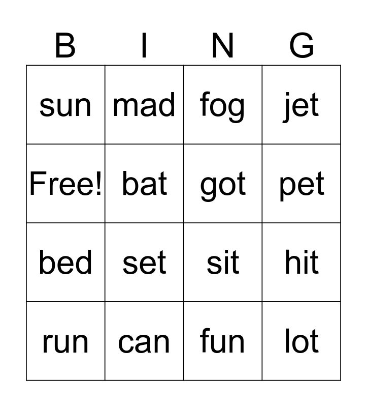 This bingo card has 16 words: can, hit, fog, sun, bed, mad, sit, fun, Free!, bat, run, jet, set, pet, got and lot.
