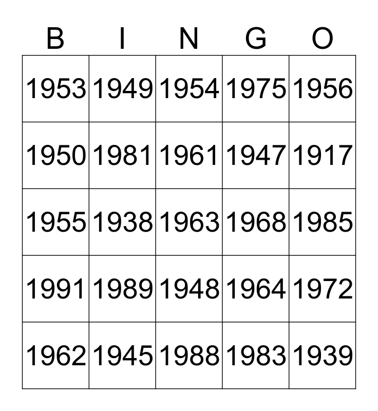 This bingo card has a free space and 24 words: 1989, 1945, 1961, 1962, 1956, 1953, 1950, 1949, 1968, 1948, 1947, 1955, 1964, 1972, 1981, 1983, 1985, 1954, 1917, 1938, 1939, 1991, 1975 and 1988.