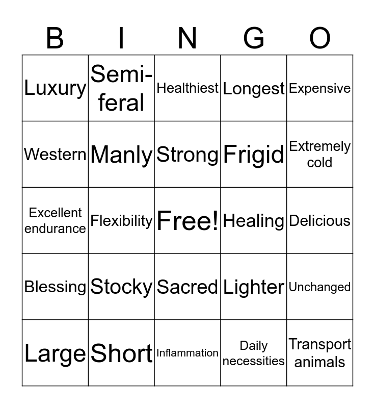 This bingo card has a free space and 24 words: Stocky, Short, Strong, Large, Expensive, Luxury, Western, Semi-feral, Healing, Sacred, Frigid, Excellent endurance, Lighter, Unchanged, Manly, Daily necessities, Delicious, Healthiest, Extremely cold, Flexibility, Transport animals, Blessing, Longest and Inflammation.
