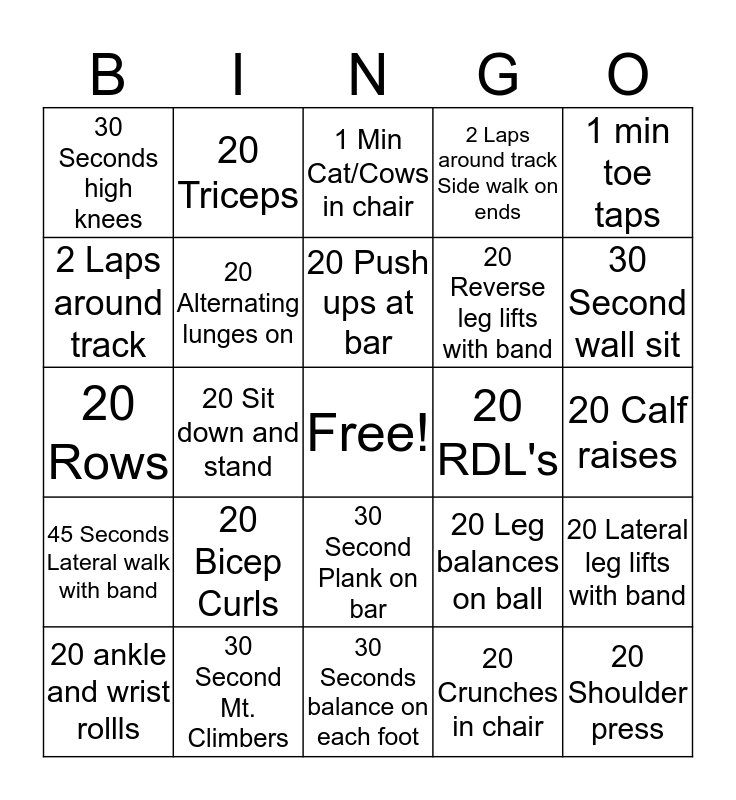 This bingo card has a free space and 24 words: 20 Bicep Curls, 30 Second Mt. Climbers, 20 Push ups at bar, 20 ankle and wrist rollls, 1 min toe taps, 30 Seconds high knees, 2 Laps around track, 20 Triceps, 20 RDL's, 30 Second Plank on bar, 20 Reverse leg lifts with band, 20 Rows, 20 Leg balances on ball, 20 Lateral leg lifts with band, 20 Alternating lunges on, 20 Crunches in chair, 20 Calf raises, 1 Min Cat/Cows in chair, 30 Second wall sit, 20 Sit down and stand, 20 Shoulder press, 45 Seconds Lateral walk with band, 2 Laps around track Side walk on ends and 30 Seconds balance on each foot.