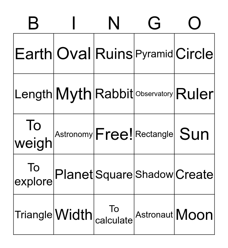 This bingo card has a free space and 24 words: Planet, Width, Rabbit, Triangle, Circle, Earth, Length, Oval, Rectangle, Square, Observatory, To weigh, Shadow, Create, Myth, Astronaut, Sun, Ruins, Ruler, Astronomy, Moon, To explore, Pyramid and To calculate.