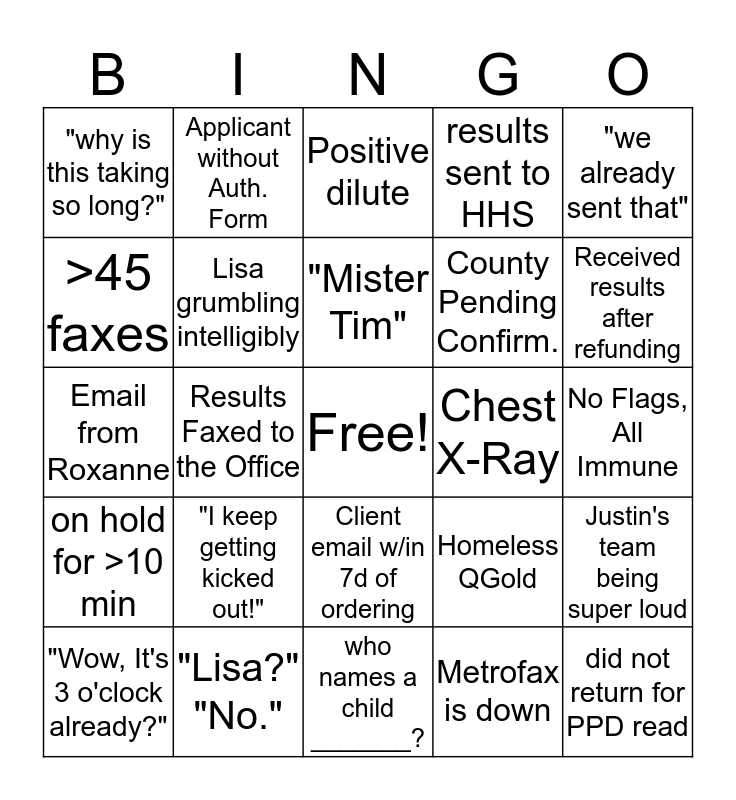 This bingo card has a free space and 24 words: "I keep getting kicked out!", "Lisa?" "No.", "Mister Tim", "Wow, It's 3 o'clock already?", "we already sent that", "why is this taking so long?", >45 faxes, Applicant without Auth. Form, Chest X-Ray, Client email w/in 7d of ordering, County Pending Confirm., Email from Roxanne, Homeless QGold, Justin's team being super loud, Lisa grumbling intelligibly, Metrofax is down, No Flags, All Immune, Positive dilute, Received results after refunding, Results Faxed to the Office, did not return for PPD read, on hold for >10 min, results sent to HHS and who names a child _______?.