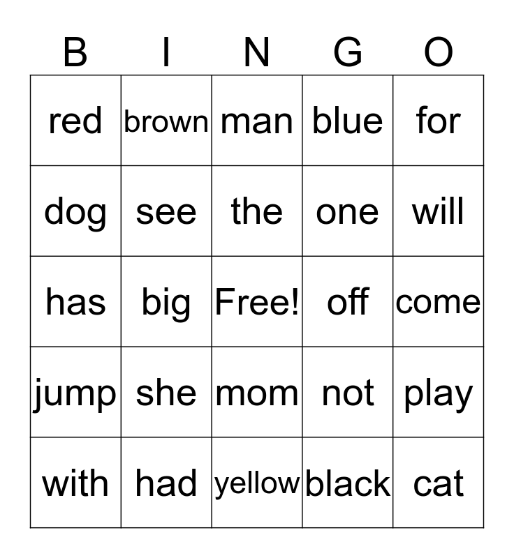 This bingo card has a free space and 37 words: you, and, like, see, play, she, the, can, for, look, big, blue, cat, come, dog, jump, little, man, mom, off, red, will, with, yellow, all, black, brown, day, down, from, get, had, has, him, not, one and two.