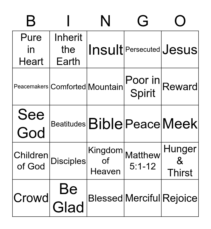 This bingo card has 25 words: Disciples, Blessed, Mountain, Crowd, Jesus, Pure in Heart, Peacemakers, Inherit the Earth, Peace, Kingdom of Heaven, Poor in Spirit, See God, Matthew 5:1-12, Hunger & Thirst, Comforted, Rejoice, Meek, Insult, Reward, Beatitudes, Bible, Be Glad, Children of God, Persecuted and Merciful.