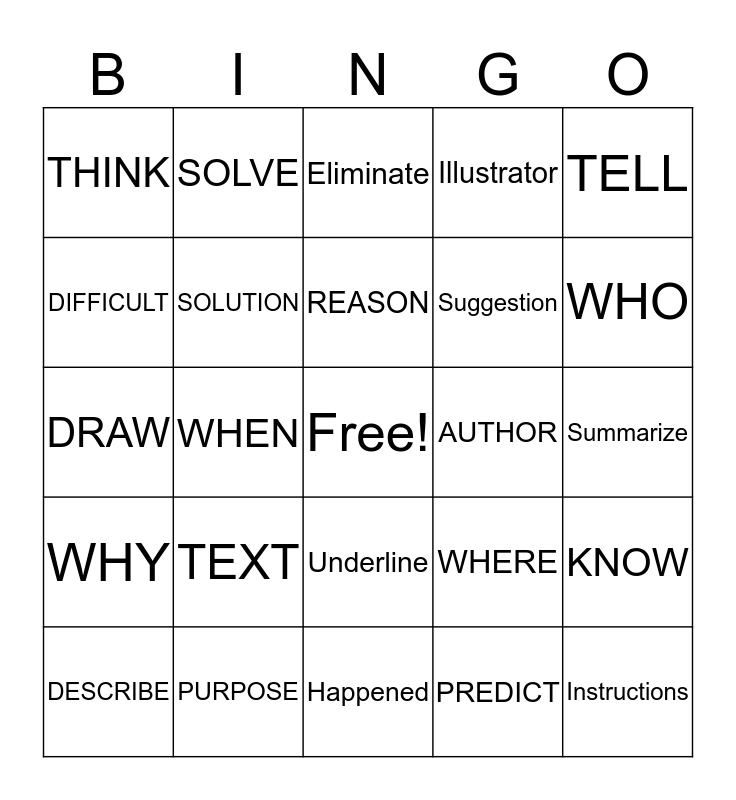 This bingo card has a free space and 24 words: TEXT, PURPOSE, REASON, DESCRIBE, TELL, THINK, DIFFICULT, SOLVE, AUTHOR, Underline, Suggestion, DRAW, WHERE, KNOW, SOLUTION, PREDICT, Summarize, Eliminate, WHO, WHEN, Instructions, WHY, Illustrator and Happened.