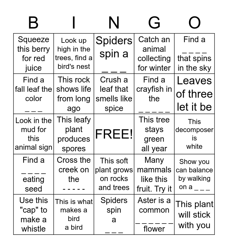 This bingo card has a free space and 24 words: Cross the creek on the - - - - -, This is what makes a bird a bird, Crush a leaf that smells like spice, Use this "cap" to make a whistle, Find a _ _ _ _ that spins in the sky, Squeeze this berry for red juice, Find a fall leaf the color _ _ _, Look up high in the trees, find a bird's nest, This tree stays green all year, This soft plant grows on rocks and trees, Find a crayfish in the _ _ _ _ _, Look in the mud for this animal sign, Many mammals like this fruit. Try it, Show you can balance by walking on a _ _ _, This rock shows life from long ago, Aster is a common _ _ _ _ _ _ flower, This decomposer is white, Spiders spin a _ _ _, Leaves of three let it be, This leafy plant produces spores, This plant will stick with you, Find a _ _ _ _ eating seed, Catch an animal collecting for winter and Spiders spin a _ _ _.