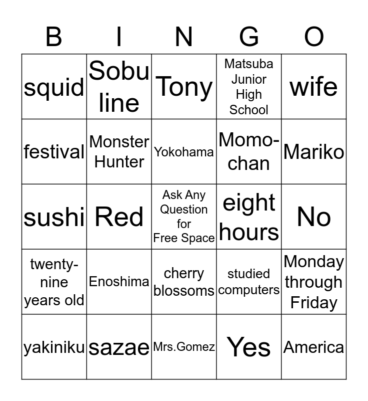 This bingo card has a free space and 24 words: Enoshima, sazae, Yokohama, yakiniku, wife, squid, festival, Sobu line, eight hours, cherry blossoms, Momo-chan, sushi, studied computers, Monday through Friday, Monster Hunter, Yes, No, Tony, Mariko, Red, America, twenty-nine years old, Matsuba Junior High School and Mrs.Gomez.