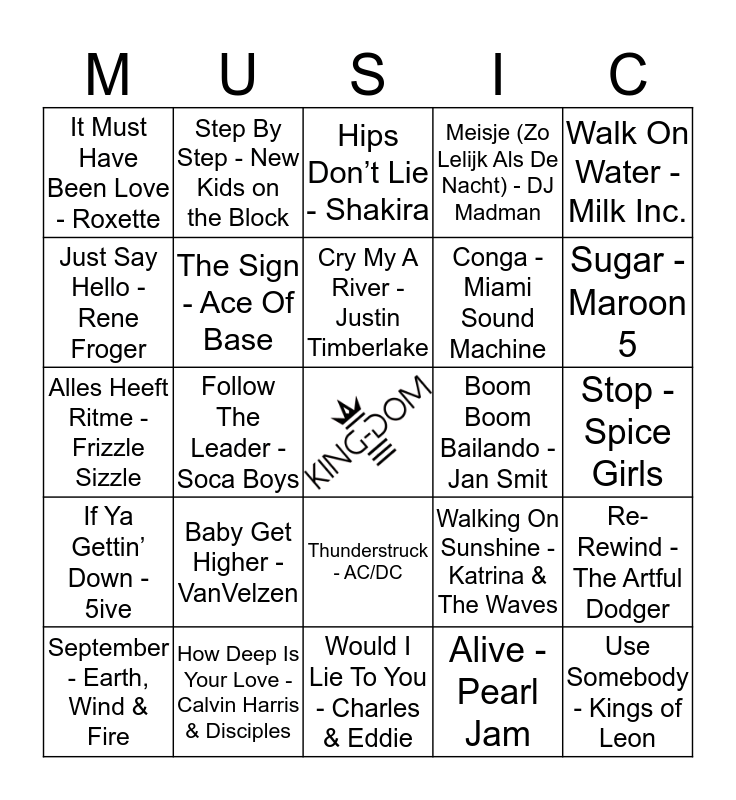 This bingo card has a free space and 24 words: Baby Get Higher - VanVelzen, How Deep Is Your Love - Calvin Harris & Disciples, Cry My A River - Justin Timberlake, September - Earth, Wind & Fire, Walk On Water - Milk Inc., It Must Have Been Love - Roxette, Just Say Hello - Rene Froger, Step By Step - New Kids on the Block, Boom Boom Bailando - Jan Smit, Thunderstruck - AC/DC, Conga - Miami Sound Machine, Alles Heeft Ritme - Frizzle Sizzle, Walking On Sunshine - Katrina & The Waves, Re-Rewind - The Artful Dodger, The Sign - Ace Of Base, Alive - Pearl Jam, Stop - Spice Girls, Hips Don’t Lie - Shakira, Sugar - Maroon 5, Follow The Leader - Soca Boys, Use Somebody - Kings of Leon, If Ya Gettin’ Down - 5ive, Meisje (Zo Lelijk Als De Nacht) - DJ Madman and Would I Lie To You - Charles & Eddie.